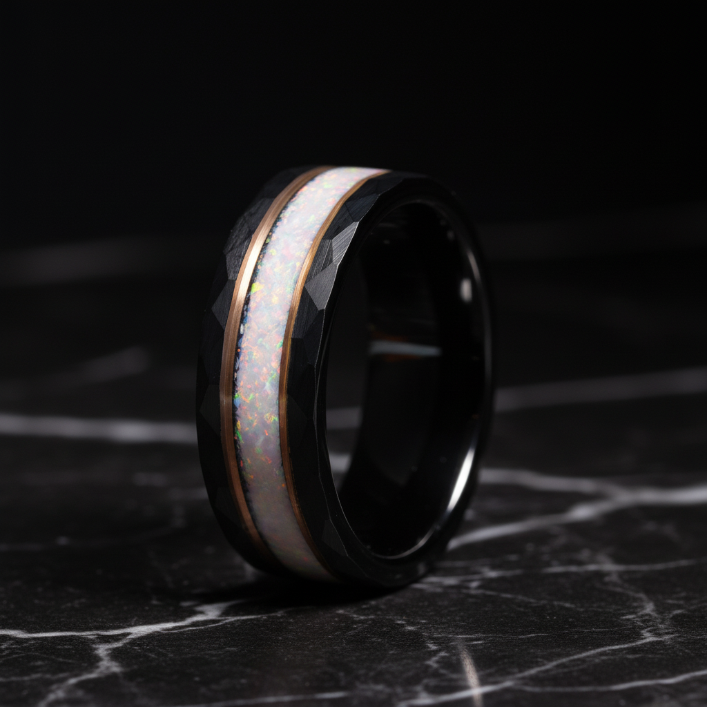 Men’s Opal Ring, Black Tungsten Band, Tungsten Wedding Ring, White Opal Ring, Rose Gold Tungsten, Hammered Wedding Band, Unique Men’s Band, Anniversary Gift Ring, Promise Ring for Him, Durable Tungsten Ring