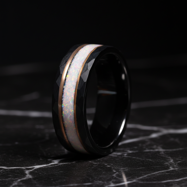The White Opal & Rose Gold Tungsten Ring is more than just a wedding band—it’s a modern heirloom. Perfect for the man who values both strength and sophistication, this hammered black tungsten ring with opal and rose gold inlay is built to last and designed to inspire.