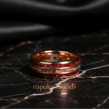 This Rose Gold Tungsten Carbide Wedding Band is designed for men who want a truly unique and meaningful ring. The inlay combines genuine ruby, rose gold leaf flakes, and meteorite fragments, creating a dazzling fusion of rich red, warm metallic tones, and cosmic shimmer. The rose gold tungsten base adds strength, durability, and a modern, luxurious finish.