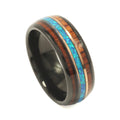 This 8mm wide wood and opal ring is set in ultra-durable black tungsten carbide, known for its superior strength and scratch resistance. A rose gold strip adds a sophisticated contrast, while the dome-polished finish gives it a refined, luxurious feel. Each band is a work of art—unique, bold, and deeply meaningful.