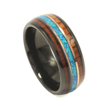 "Kauai" Hawaiian Koa wood Opal Rose Gold Strip Dome Polished Black Tungsten Carbide Ring, 8mm