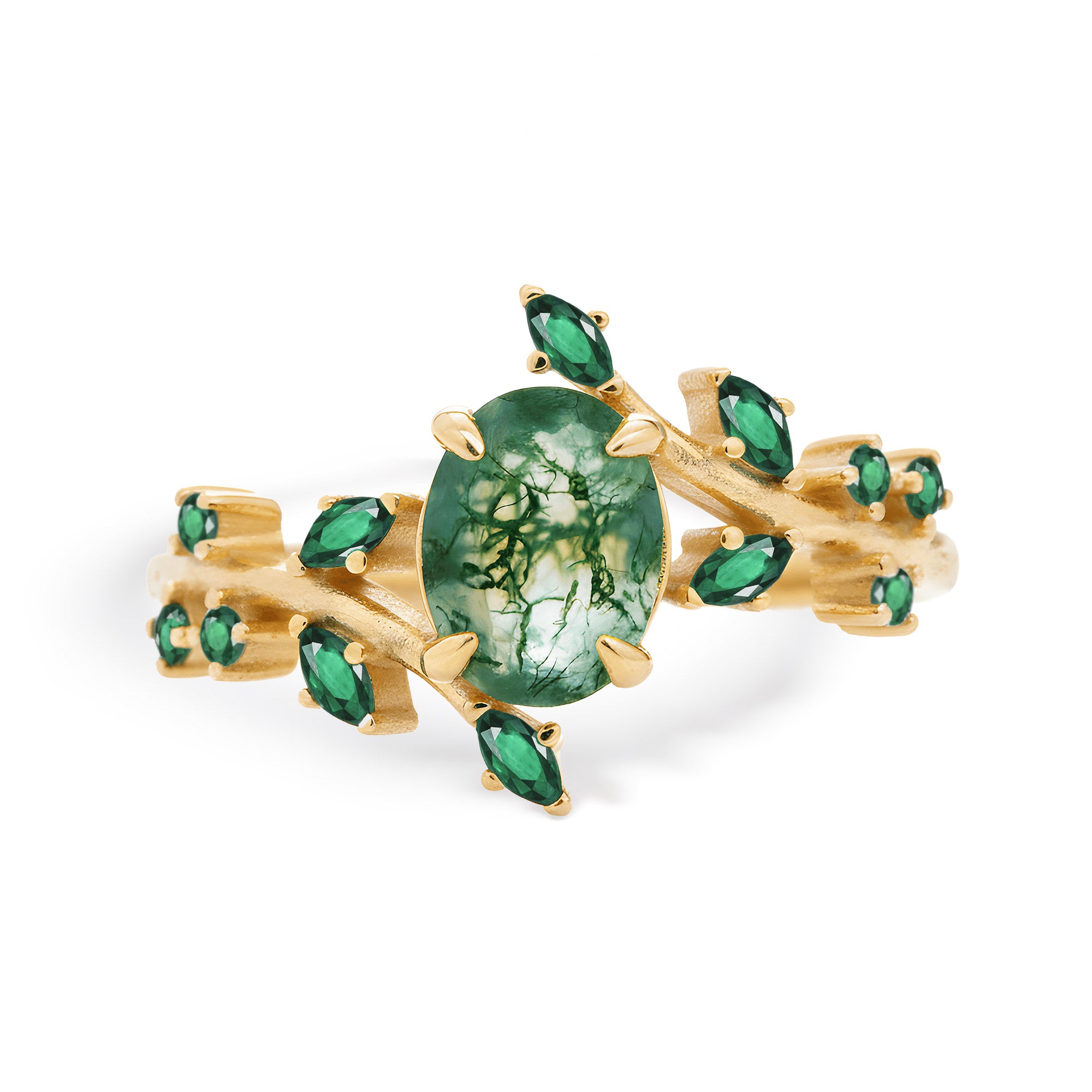 Moss Agate & Emerald Leaf Engagement Ring Set – 14K Gold Vermeil