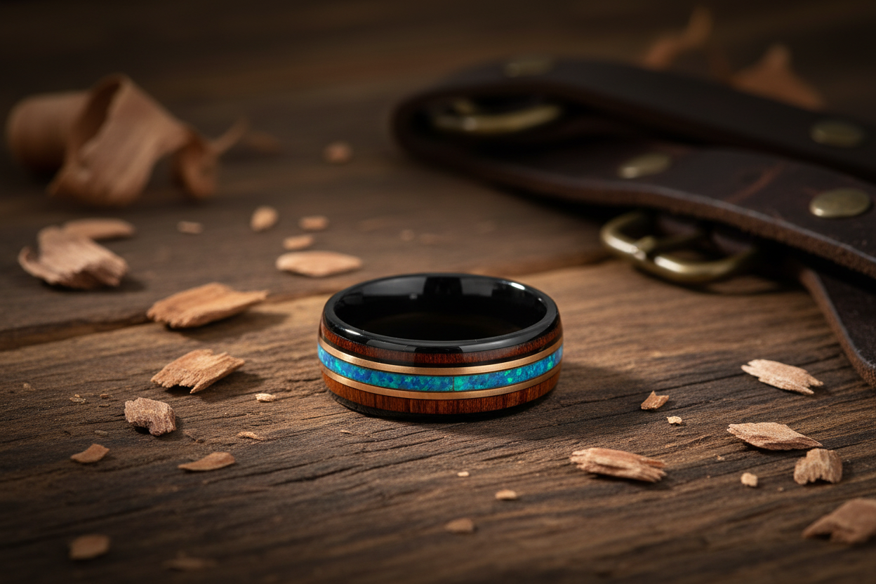We fuse rugged materials with modern details to make rings that speak. That might be a black men's wedding ring made from hammered tungsten, a shimmering inlay of deer antler, whiskey barrel and koa wood, or even a mens guitar string wedding band designed for a musician's soul. Our craftsmanship is personal. It always will be.
