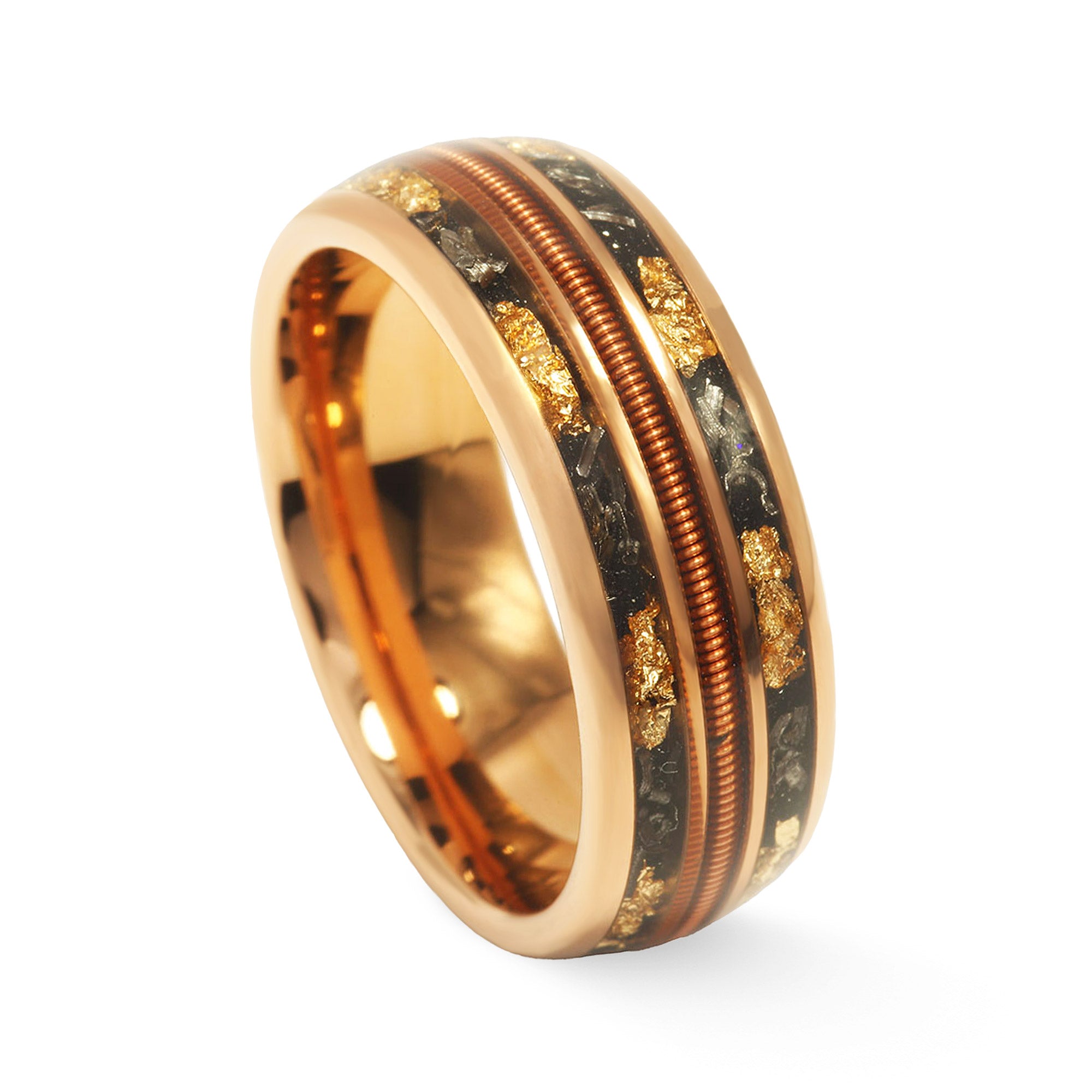 "Rockstar" 24k Gold Leaf Meteorite Men’s Wedding Bands, Guitar String Inlay Tungsten Carbide Ring, Rose Gold Dome Polish, 8mm