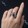 This galaxy sandstone ring set combines celestial sparkle with elegant craftsmanship. The starry sandstone center evokes the wonder of the universe, while sapphire leaves and CZ accents add brilliance and depth. A perfect gift for engagements, promises, or anniversaries, it’s a ring that celebrates love as infinite as the night sky.
