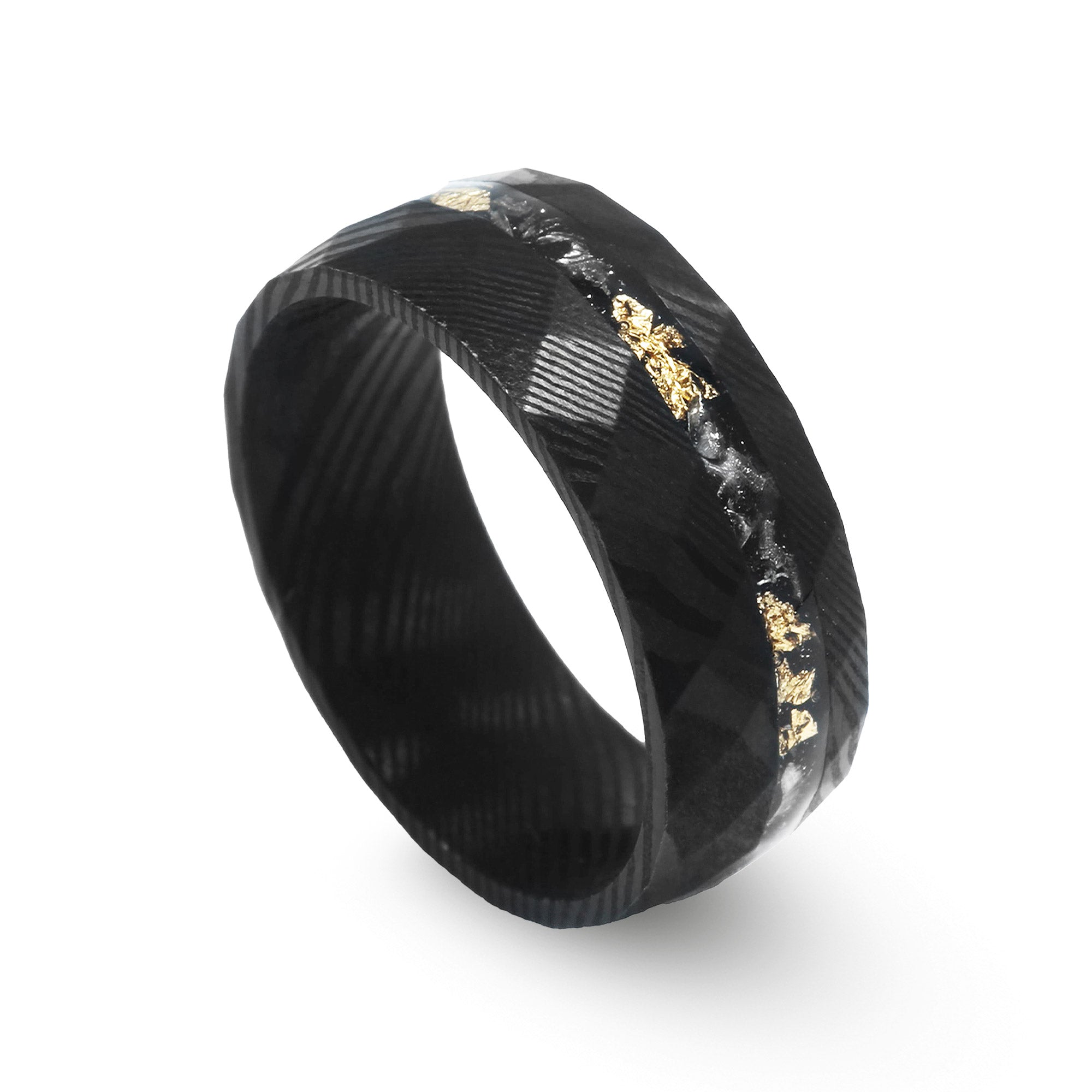 'Apollo' Crushed Meteorite 24k Gold Leaf Hammered Damascus Steel Ring, 8mm