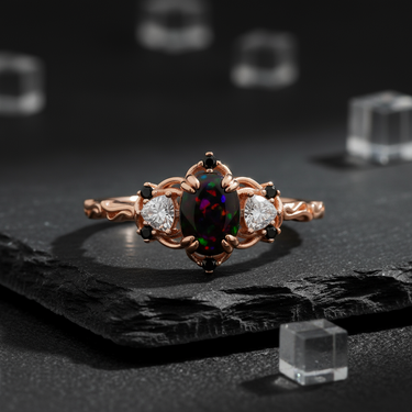 Black Fire Opal Engagement Ring – Oval Cut with CZ & Onyx Accents