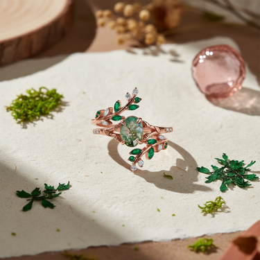 This rose gold moss agate and emerald leaf ring set combines natural beauty with refined design. The unique inclusions of the moss agate ensure that no two rings are ever the same, while the emerald and CZ accents add brilliance and contrast. Perfect for engagements, promises, or anniversaries, it’s a heartfelt piece that celebrates love’s uniqueness.