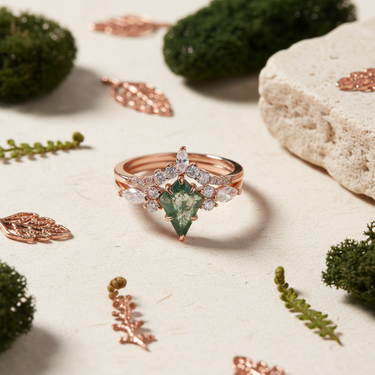 Nature meets elegance in this Rose Gold Green Moss Agate Kite-Cut Ring Set, designed for those who cherish unique, meaningful jewelry. The engagement ring features a natural green moss agate gemstone in a kite cut (7.2 x 10.3 mm, approx. 1.65 ct.), celebrated for its lush, forest-like inclusions that evoke serenity and growth.