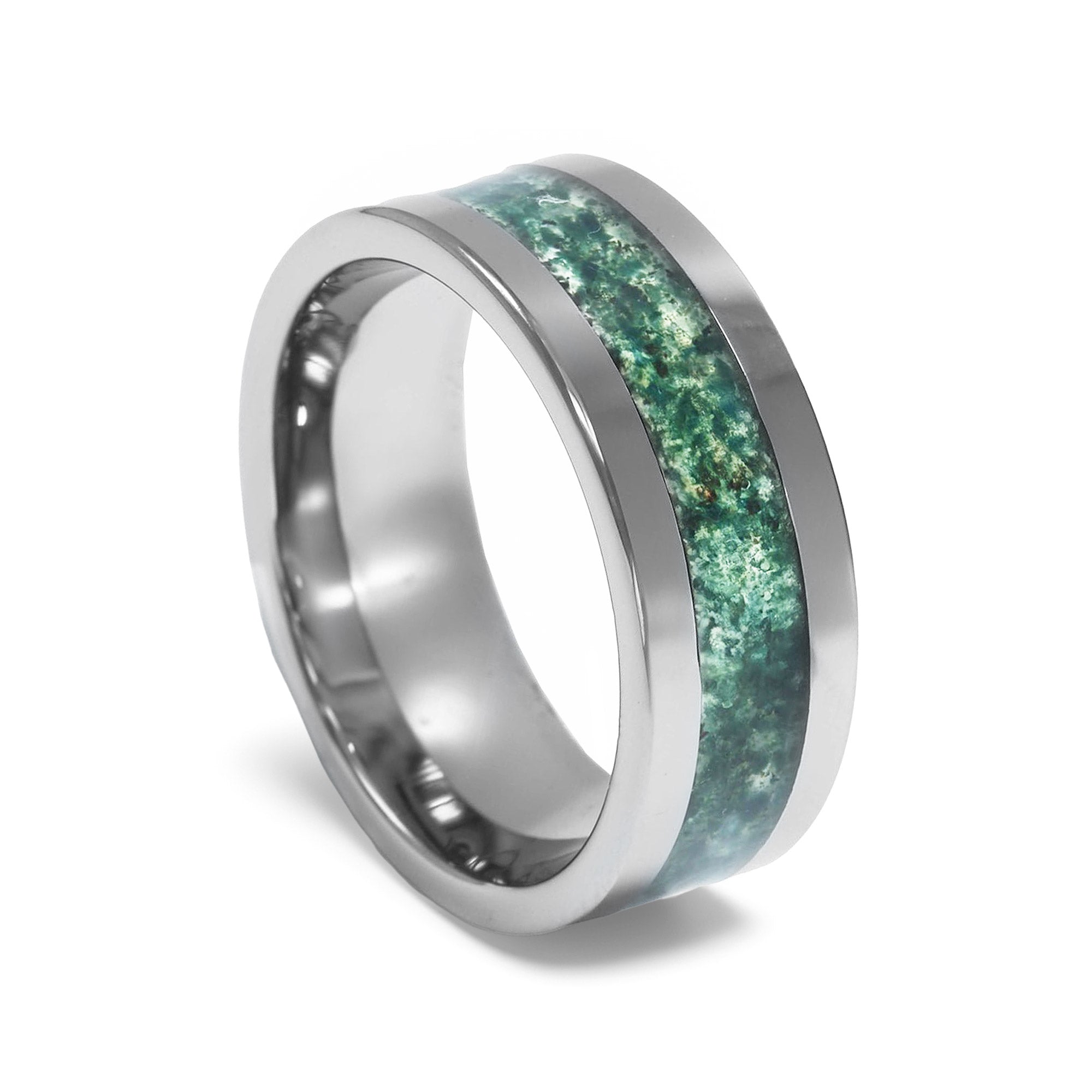 "Enchanted" Moss Agate, Silver Tungsten Carbide, Polished Finish, Men's Wedding Ring-8mm