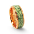 Discover timeless elegance inspired by the earth with the Gaia – a refined 8mm men's wedding band that merges natural beauty with modern sophistication. Crafted with a polished dome design, this ring features a stunning green moss agate inlay encased in durable rose gold tungsten carbide. Every detail is thoughtfully designed to reflect balance, growth, and enduring love.