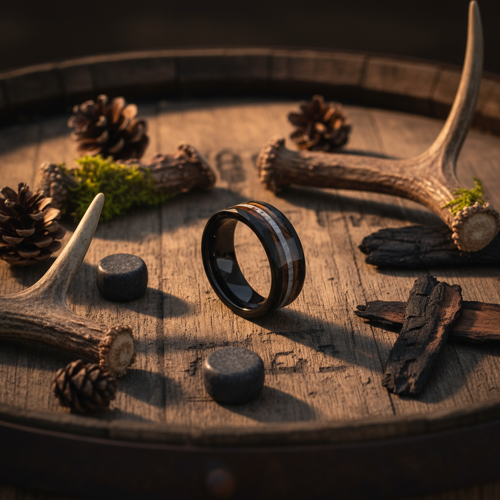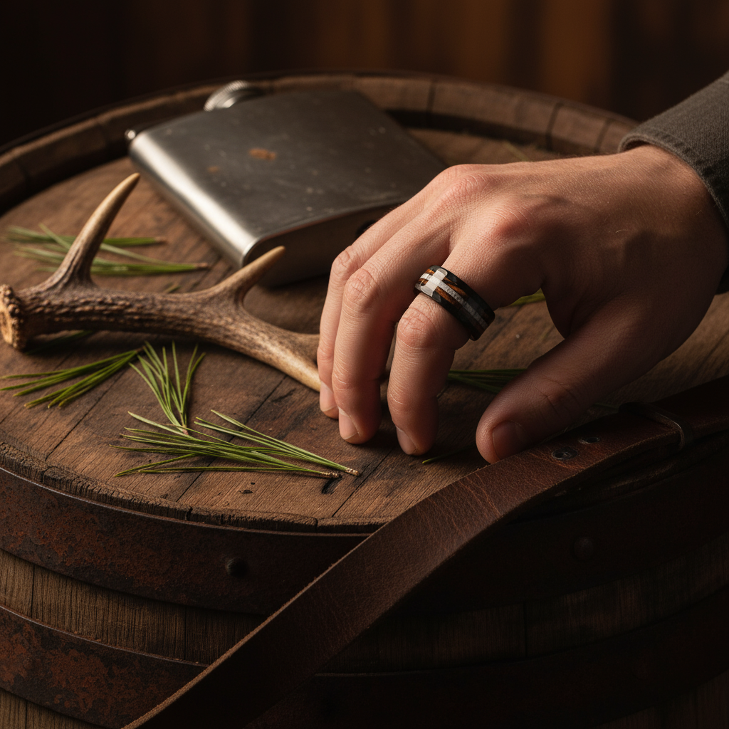 Forge your own path with the “Adventurer” Whiskey Barrel and Deer Antler Ring, a bold symbol of rugged individuality and timeless commitment. Designed for the modern-day explorer, this rustic men’s wedding ring combines natural strength and heritage with cutting-edge craftsmanship.