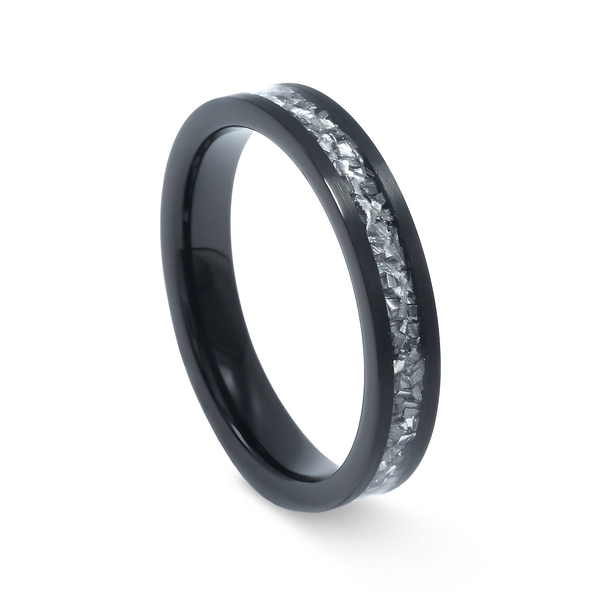 The “Stellar Elegance” is a celestial-inspired meteorite women's wedding band crafted with sophistication and meaning. Designed in a sleek 4mm width, this ring features a genuine Muonionalusta meteorite inlay—one of the oldest meteorites known to man—set against a deep black tungsten carbide body with a refined brushed finish.