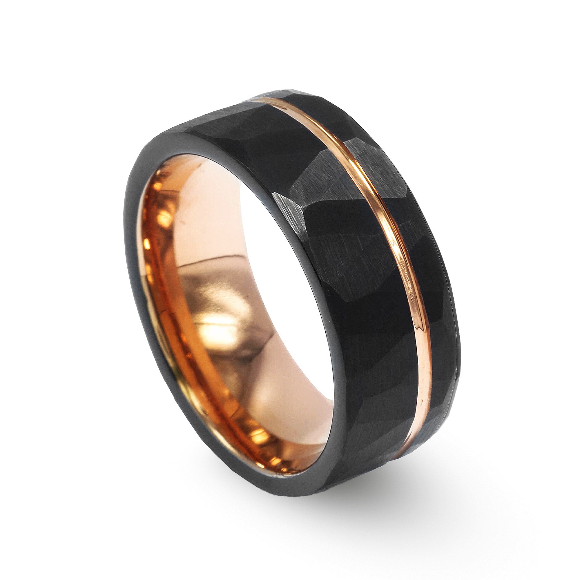 "CEO" Rose Gold Strip, Black Hammered Tungsten Carbide, Men's wedding band, 8mm