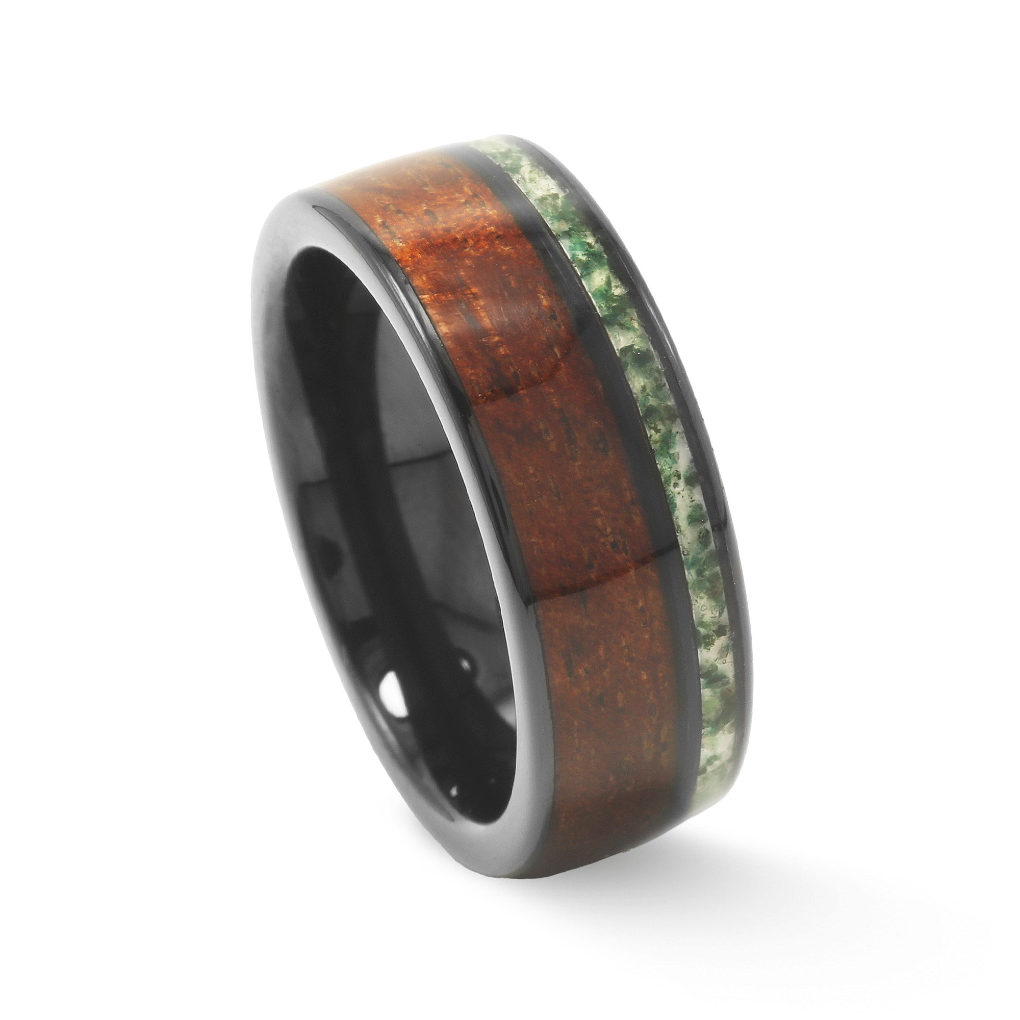 ● Distinctive Inlay Design: The natural elements of whiskey barrel wood and moss agate make every ring one-of-a-kind.