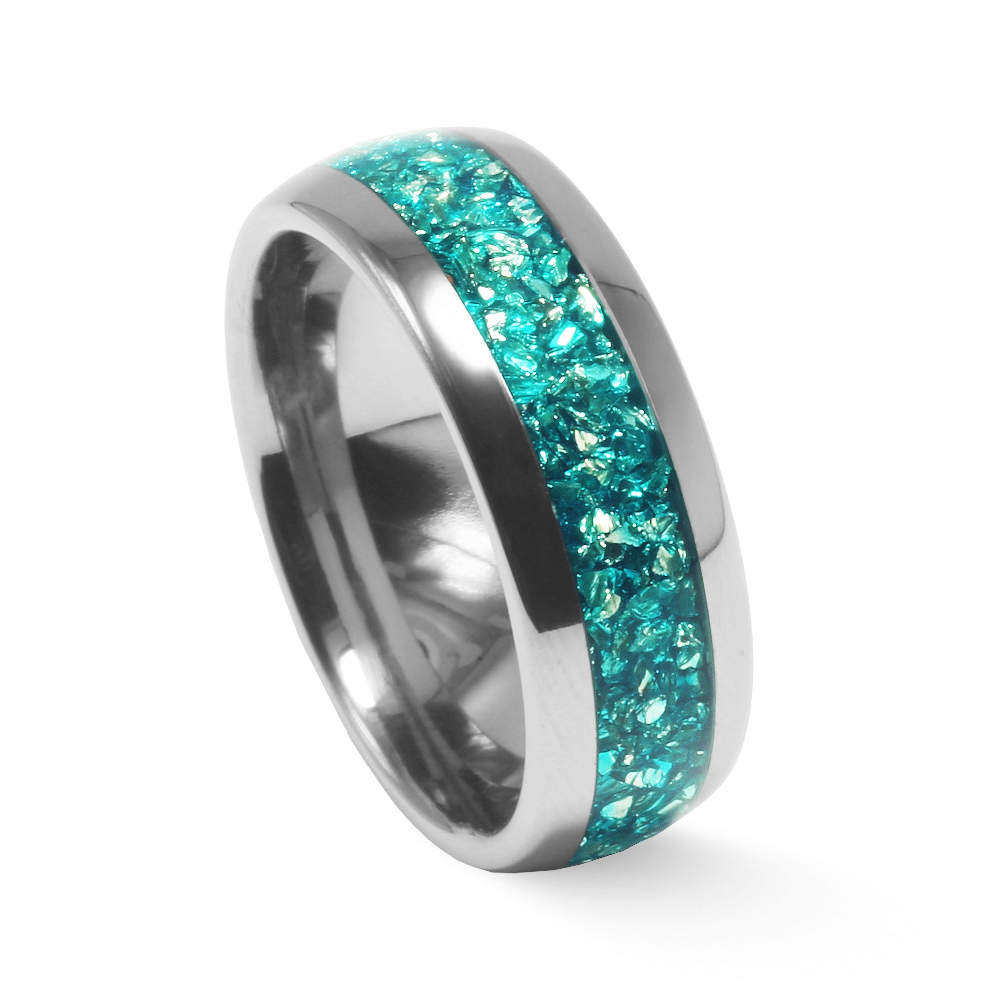The Aquarion wedding band combines modern durability with timeless symbolism. Crafted in polished silver tungsten carbide and accented with a genuine blue aquamarine inlay, this 8mm band reflects clarity, devotion, and calm strength—perfect for marking love that lasts.