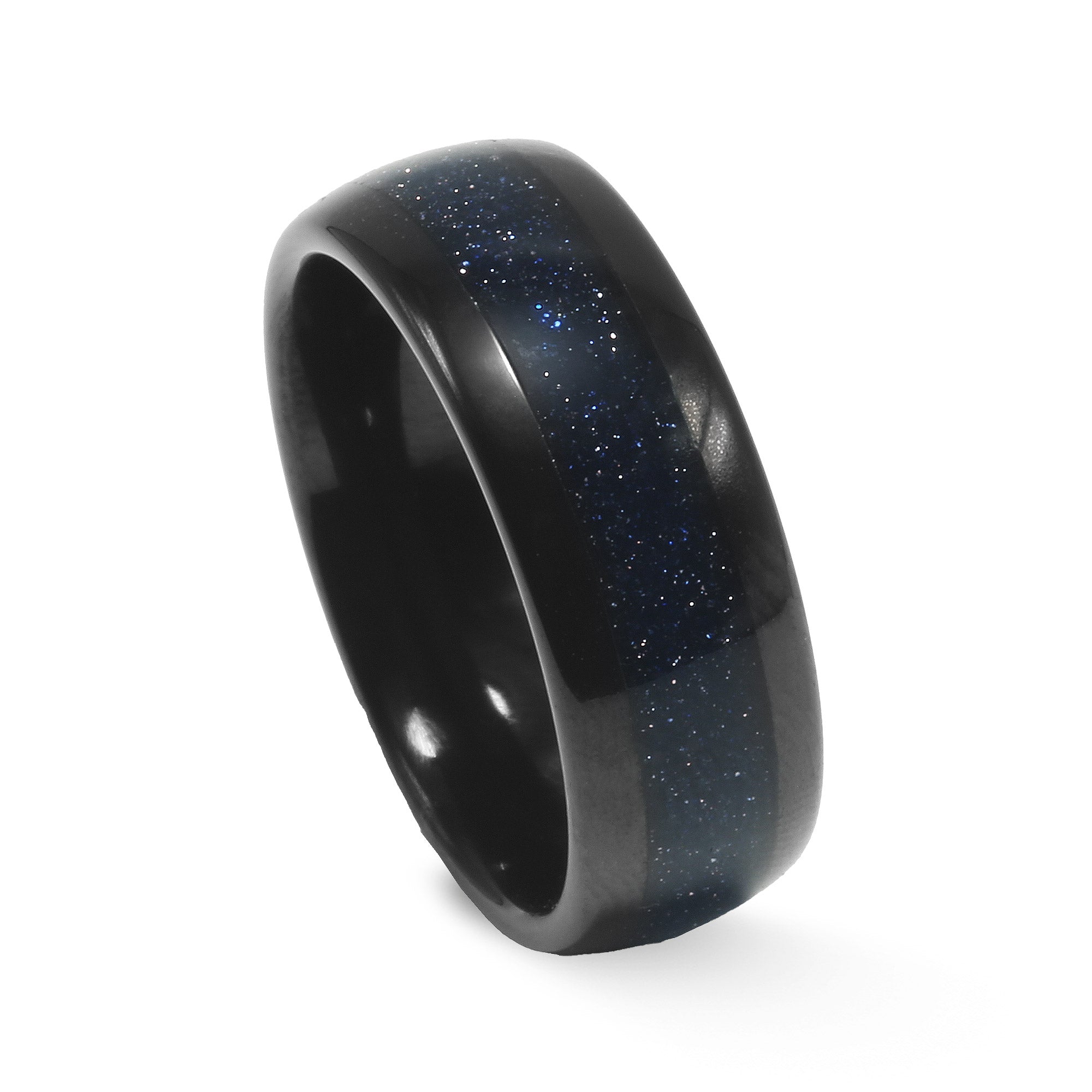 Crafted for those drawn to the cosmos, the Galaxor ring is a bold tribute to the mystery and brilliance of the nebula galaxy. Made from durable tungsten carbide, this black tungsten ring for men features a deep black domed band with a crushed blue sandstone inlay—designed to catch light and shift hues from rich blue to cosmic purple, mimicking the ethereal glow of distant galaxies.