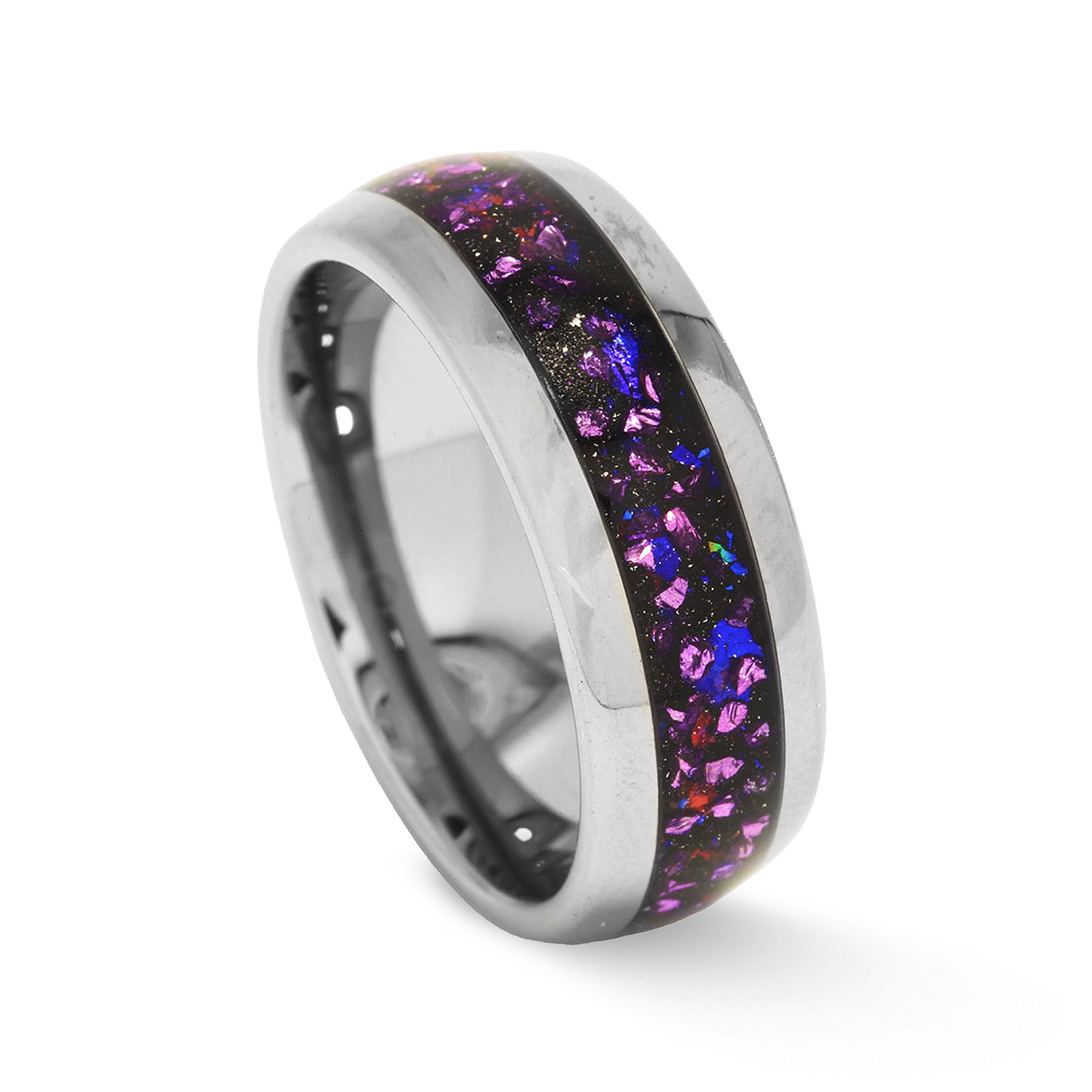 Paired with color-shifting sandstone, believed to carry rejuvenating and cosmic energy, the inlay channels a deep connection to the universe. Together, these elements form a mystical design that stands out from traditional styles like the moss agate wedding band or the deer antler inlay ring. This celestial blend is encased in a durable, protective coating that shields the inlay from water, dirt, grime, and daily wear—preserving its vivid brilliance for years to come.