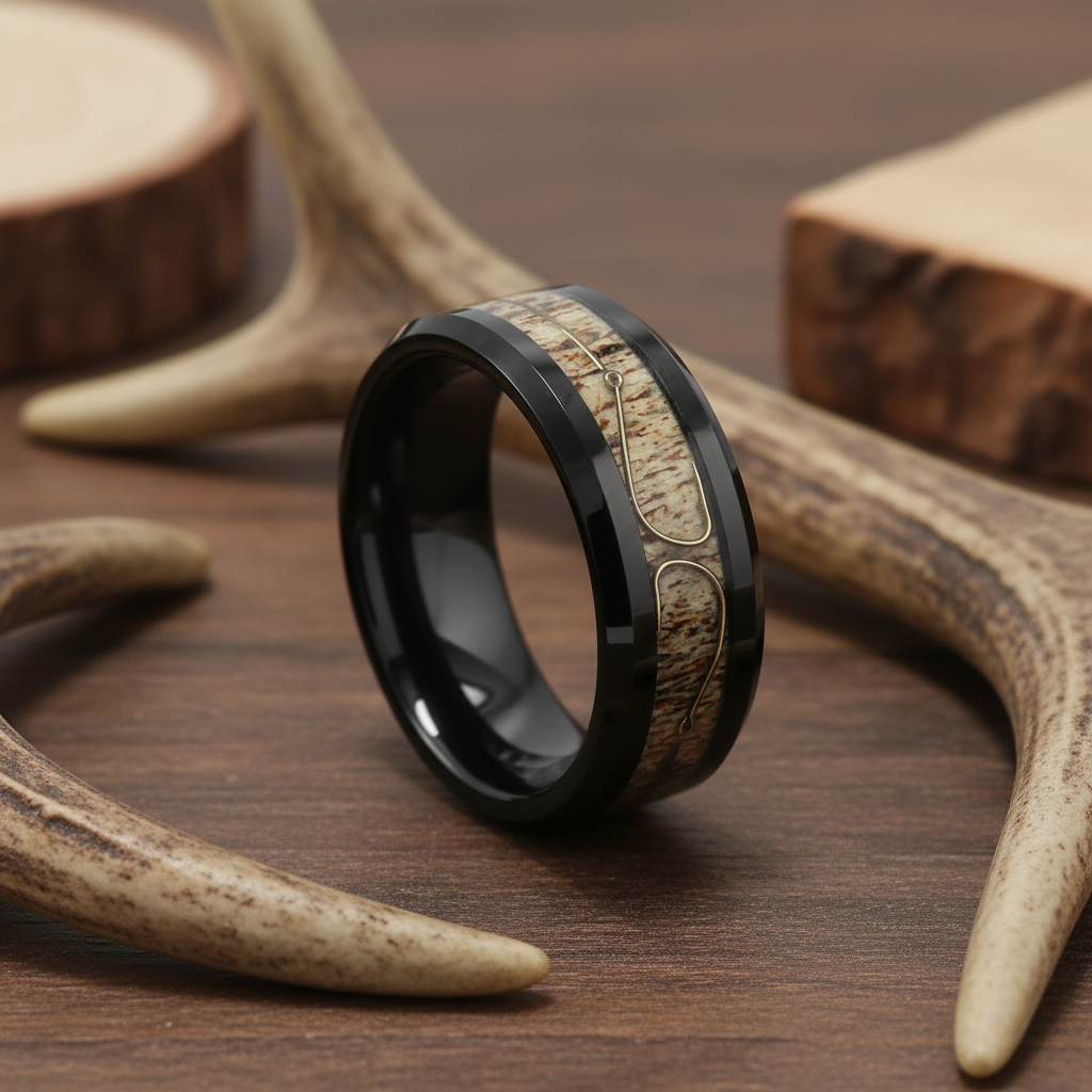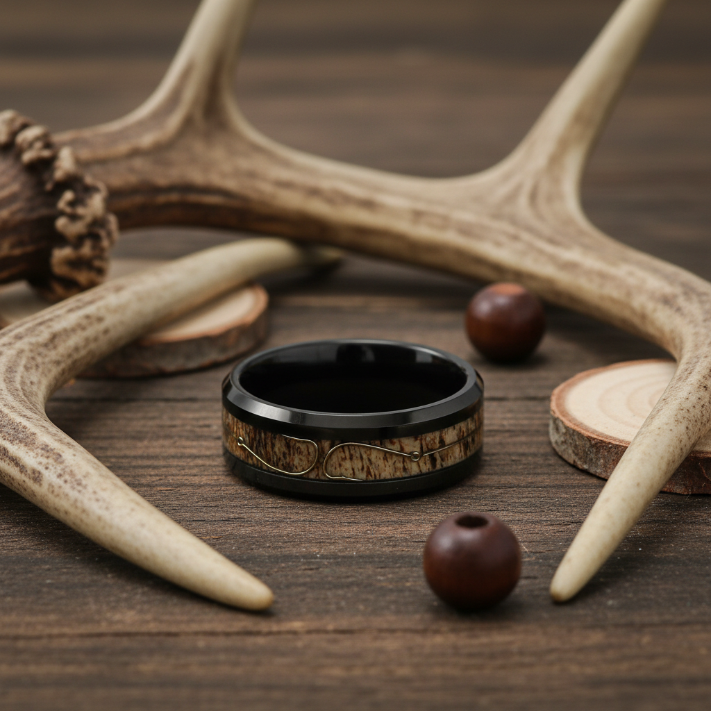Authentic Antler Inlay – Naturally patterned and sealed for strength; every ring is unique.