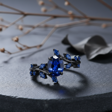 "Midnight Bloom" – Blue Sapphire Black Engagement Ring with Sapphire Leaf Accents