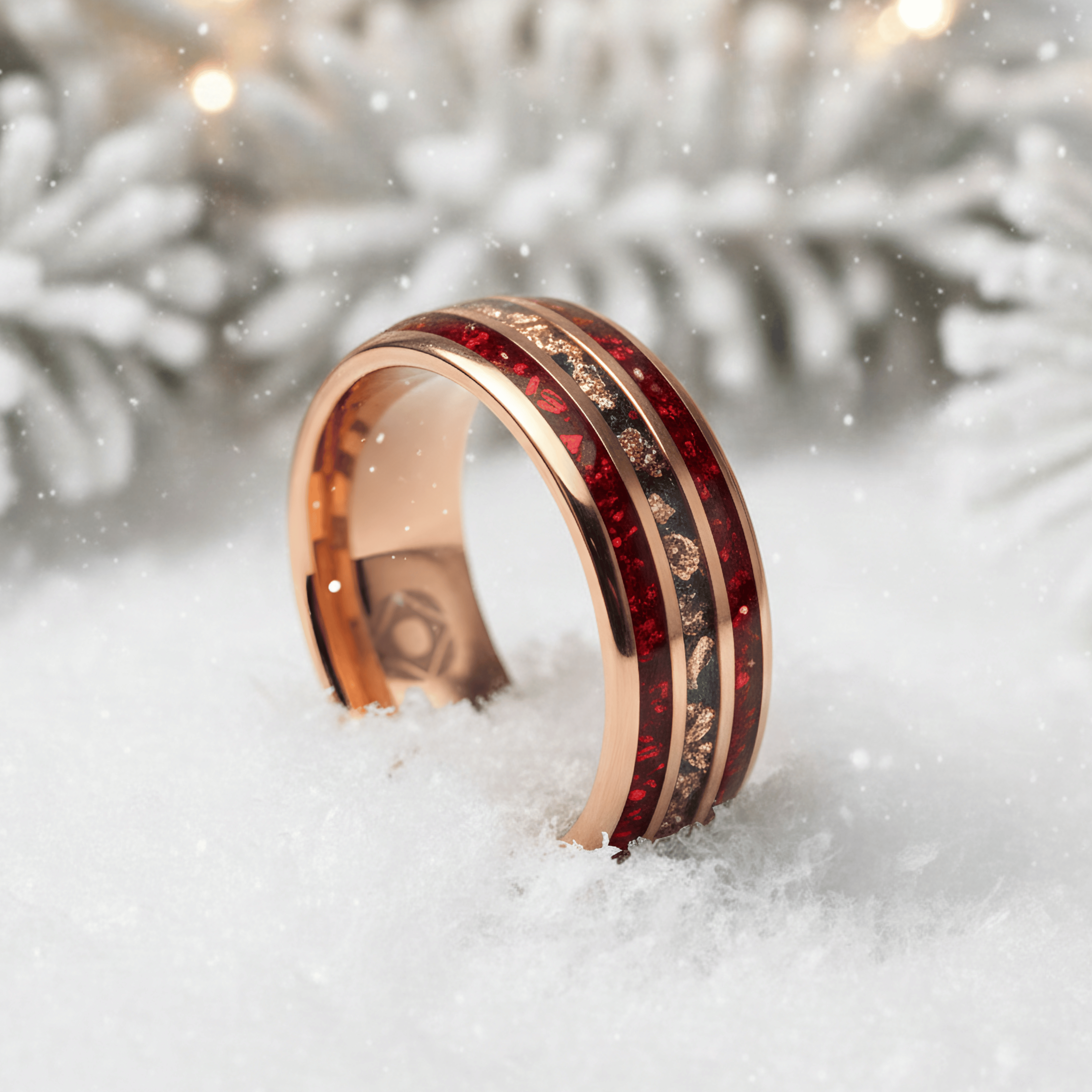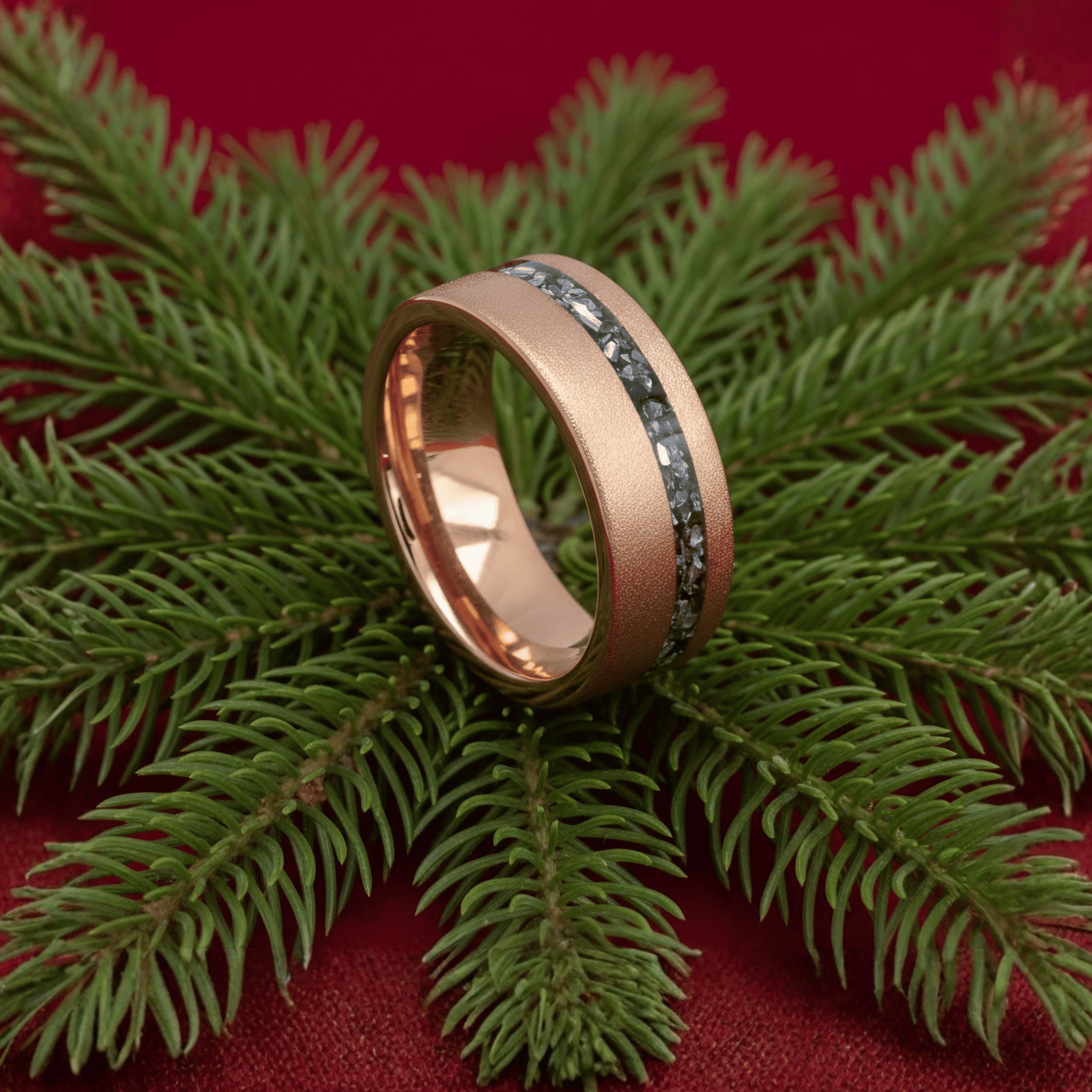 Crimson Nova – Ruby, Meteorite & Rose Gold Leaf Tungsten Wedding Band – 8mm