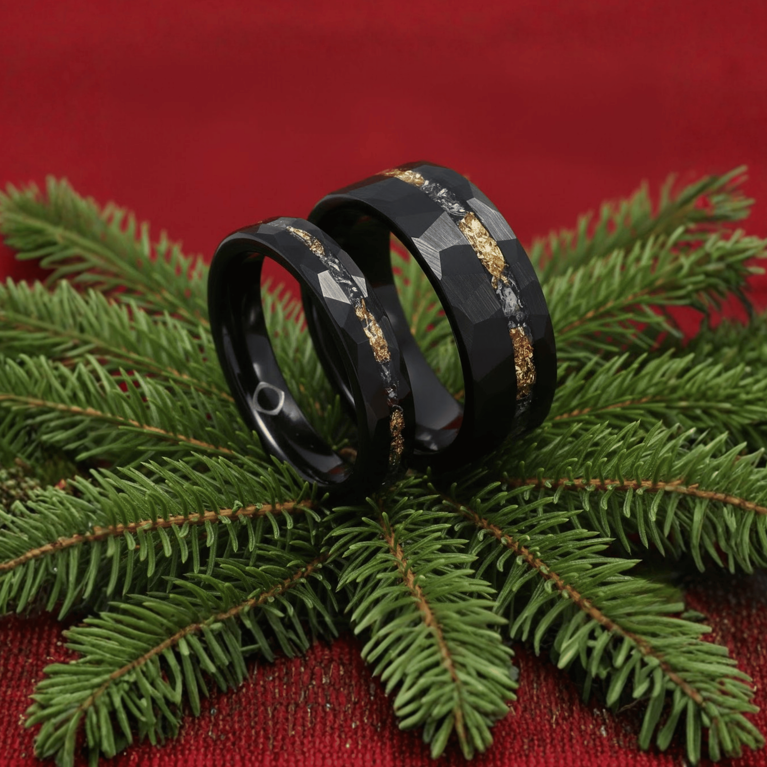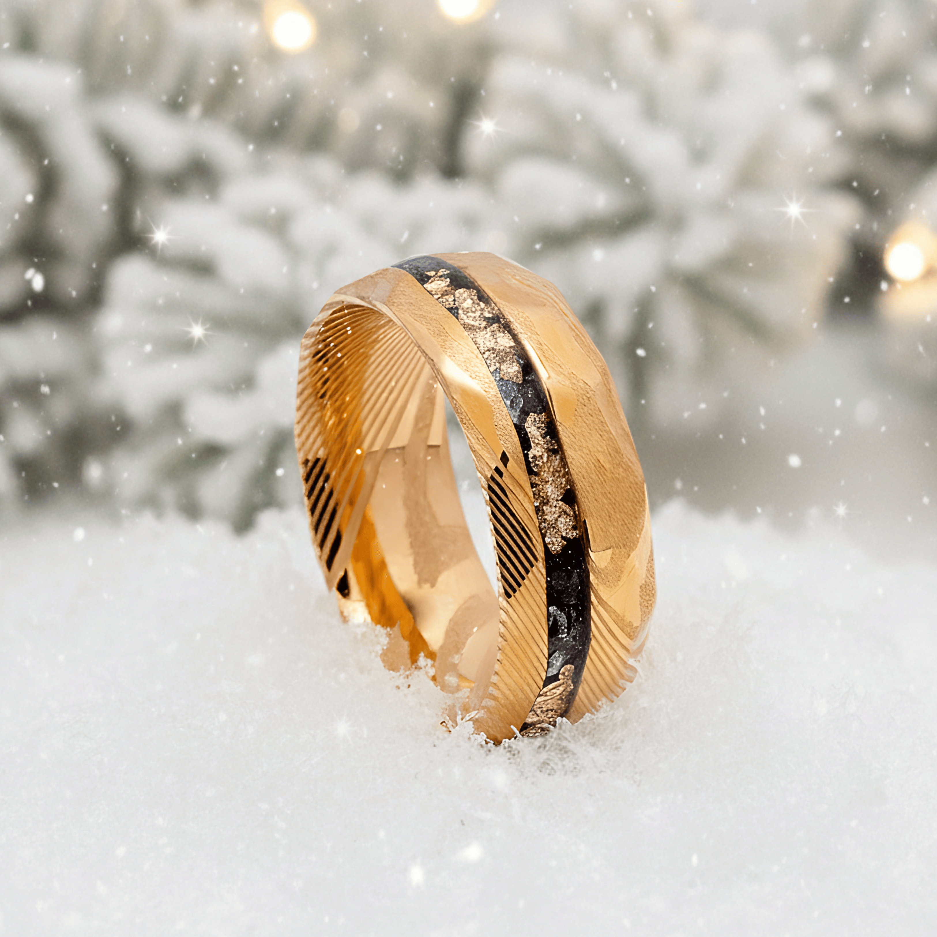 Eternal Solaris – Meteorite & 24K Gold Flake Inlay Yellow Gold Damascus Steel Wedding Band – 8mm