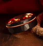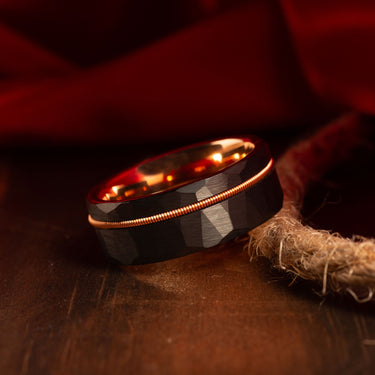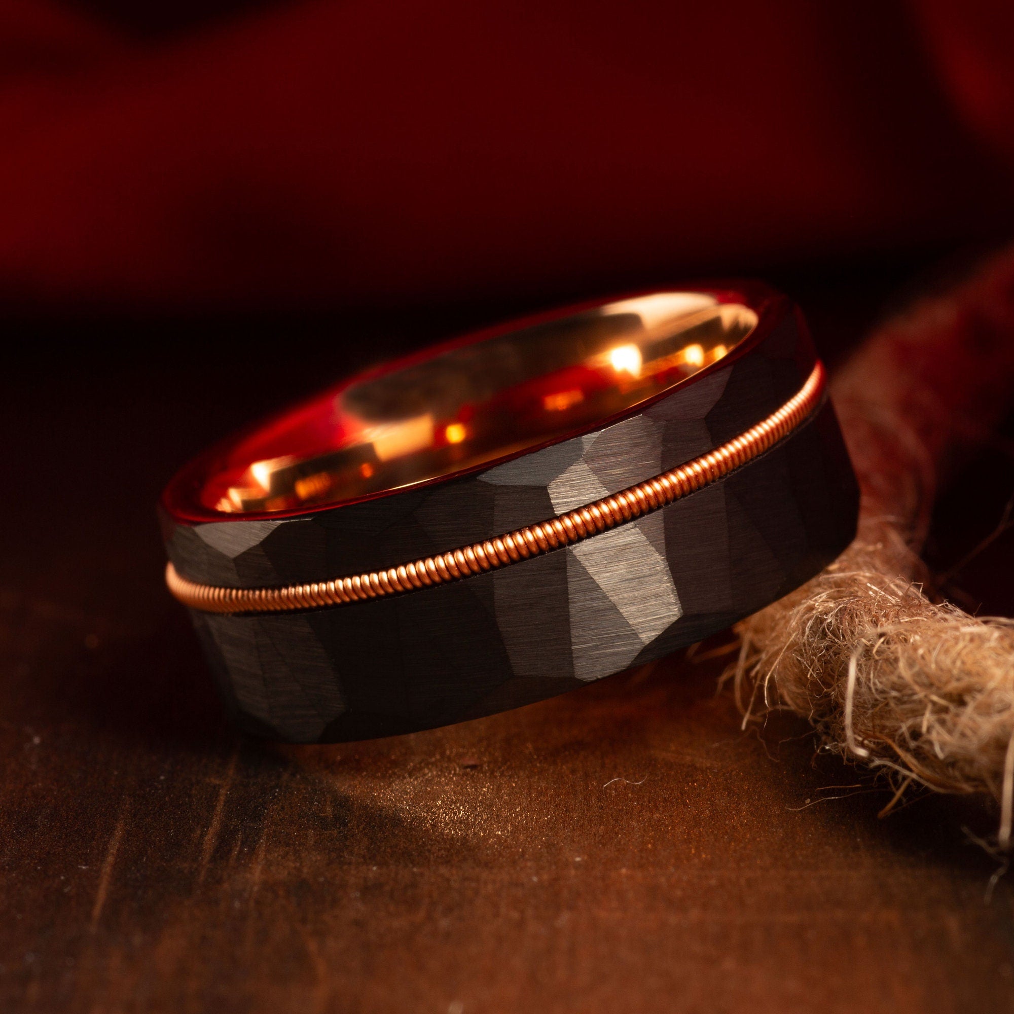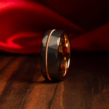 Celebrate your passion for music with the "Guitarist" – a bold and meaningful guitar string wedding band crafted for musicians, artists, and anyone whose soul is tied to sound. This ring merges artistry and strength, featuring a real rose gold guitar string inlay across a hammered black tungsten carbide band — a perfect tribute to your rhythm in life and love.